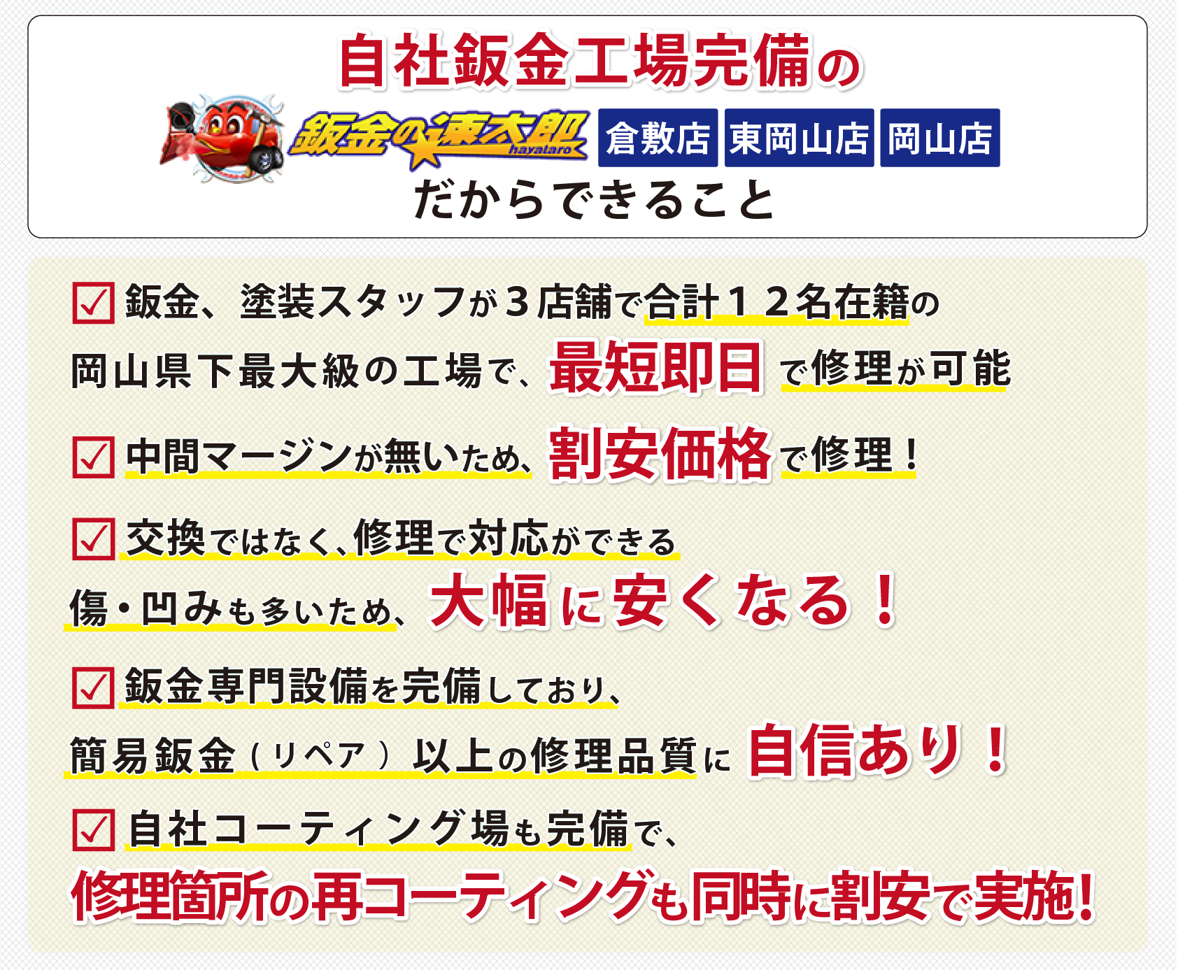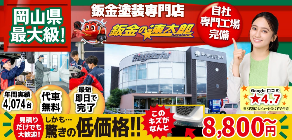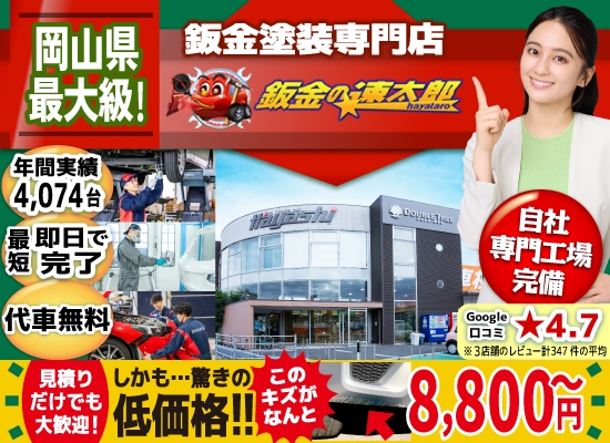 「鈑金の速太郎」倉敷店・岡山店では専門の設備と日本ペイント塗料(水性塗料WB)を使用し、国産車から高級外車のバンパー・ドア・フェンダー・ルーフ・ボンネット・バックドア等のキズ直し、鈑金・修理を高品質に仕上げます。