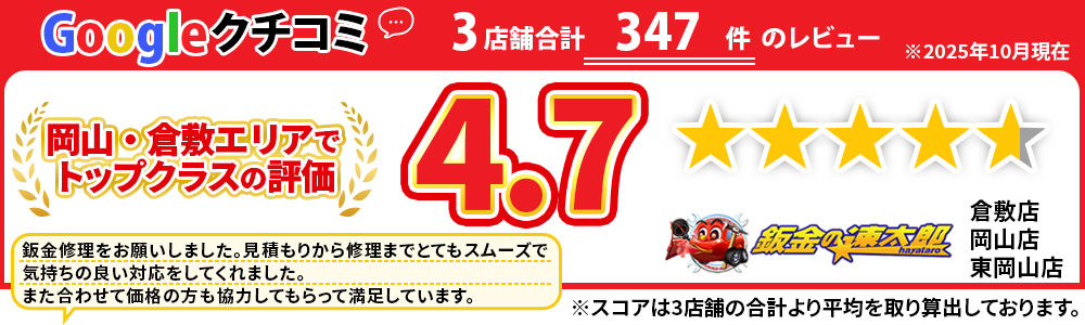当店は倉敷市・岡山市・玉野市・総社市・浅口市・笠岡市エリアの皆様に選ばれて、当店の板金修理台数は年間4,074台!(2023年実績)