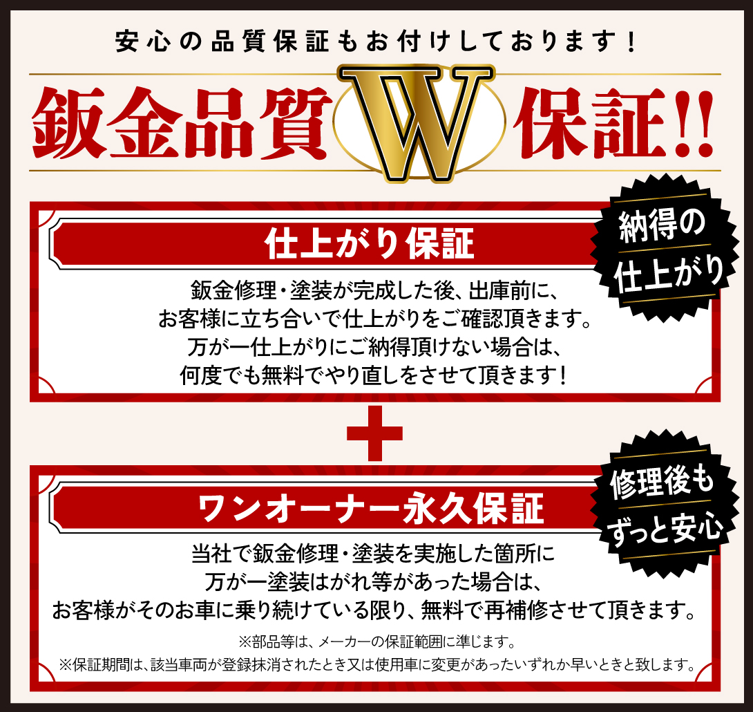 ※保証期間は、当該車両が登録抹消されたとき又は使用者に変更があったいずれか早いときと致します。(ワンオーナー保証)