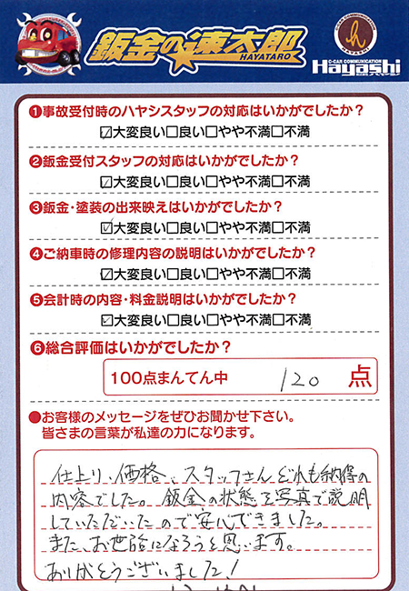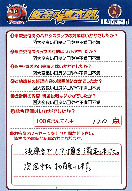 綺麗になおしてくださり、また洗車までしていただき有り難うございました。