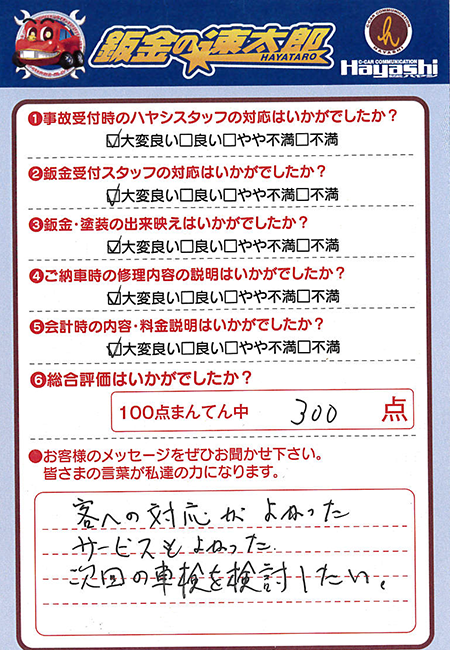 初めての車の修理で不安だらけでしたが、見積りからどのように修理するか細かく説明してくださりとても安心して任せることができました。修理対応や代車の手配も早くとても助かりました。